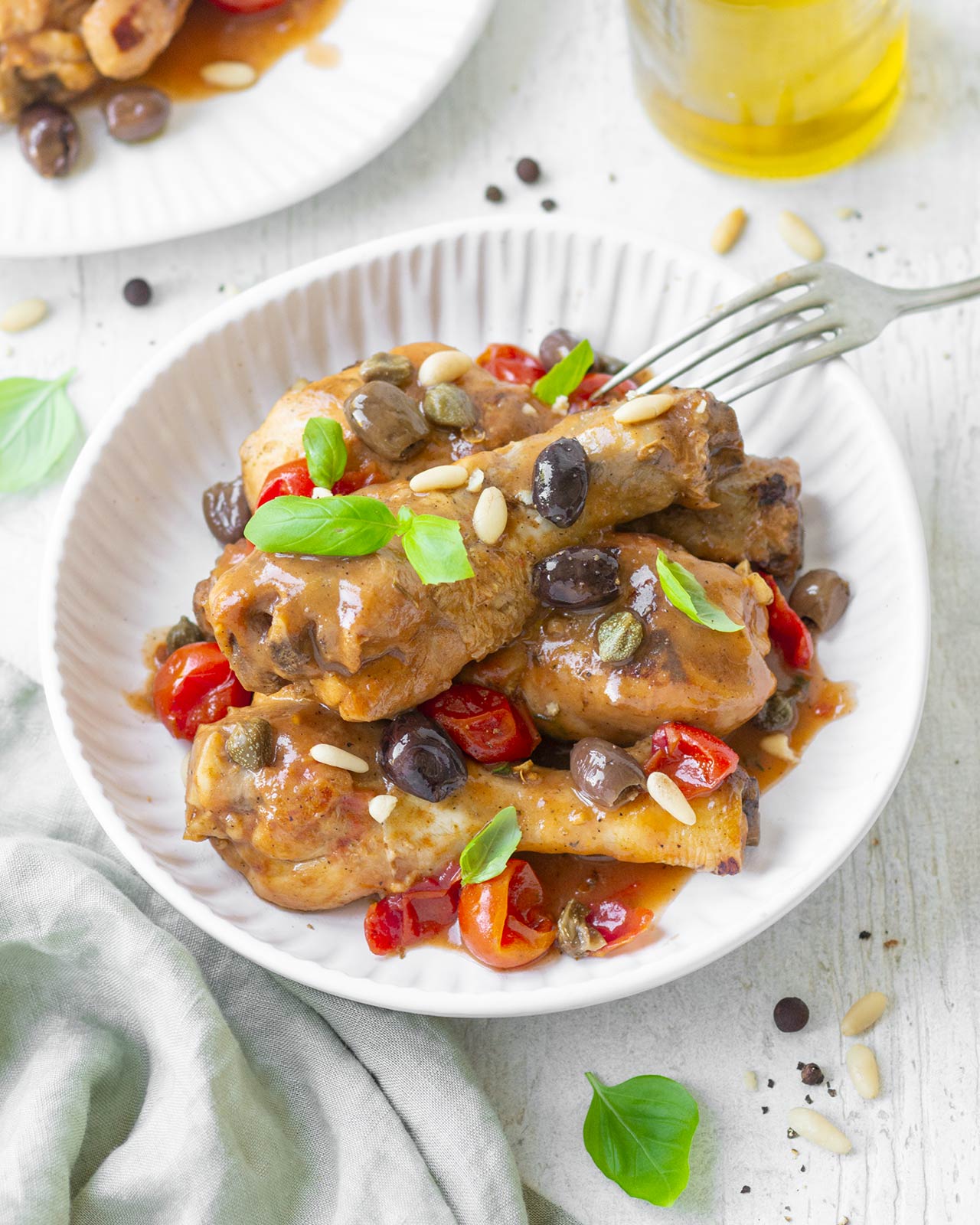 La cottura è in umido, come nella cacciatora toscana, ma qui i profumi cambiano: il pollo assorbirà la sapidità delle olive, l’aromaticità del pomodoro e l’intensità dei capperi, dando vita a una salsa vivace e profumata.