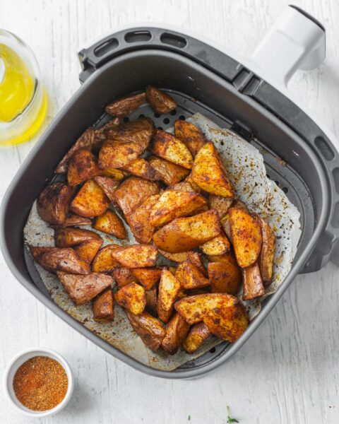 Ho preriscaldato la friggitrice ad aria a 200 °C, ho disposto le patate rosse condite in un unico strato nel cestello e ho cotto 10/12 minuti, scuotendo a metà cottura; verso la fine ho controllato la cottura e la doratura (dipende molto dalla dimensione dei dadini), aggiustandola all’occorrenza.