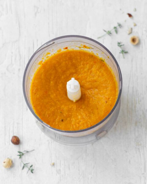 La zucca arrostita al forno mi permette di ottenere una crema densa, compatta, dal colore intenso. Non la stempero troppo perché mi piace che resti avvolgente e che si leghi bene al formato di pasta. In questo caso ho scelto qualcosa di corto e rigato, capace di trattenere la salsa all’interno.