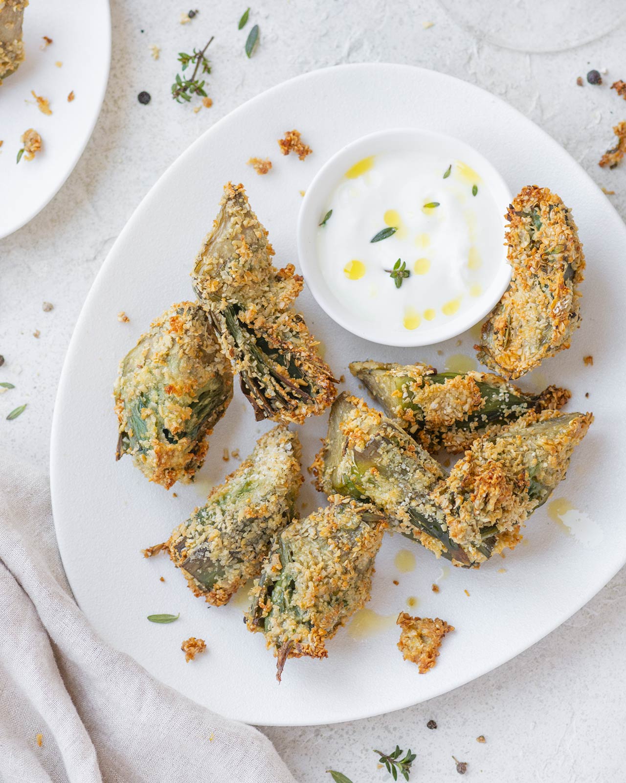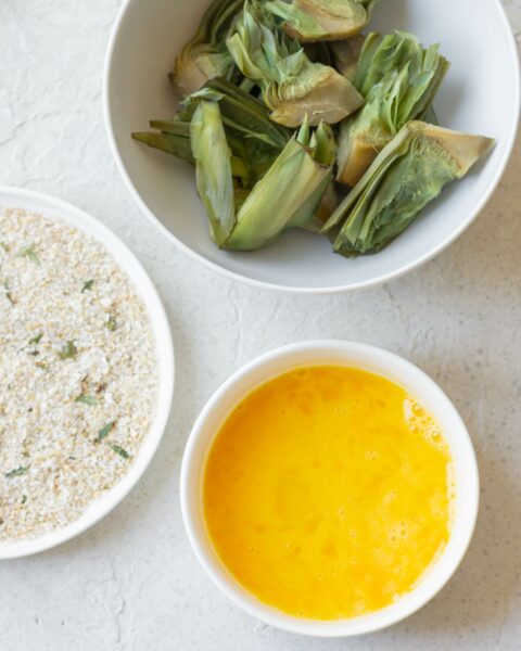 Per questa versione ho scelto una panatura senza glutine, a base di pangrattato gluten free arricchito con un trito di aglio ed erbe aromatiche. Un mix semplice ma efficace, che profuma il piatto e valorizza il sapore del carciofo senza coprirlo. Le erbe possono variare in base alla stagione e a quello che hai a disposizione: prezzemolo, timo, maggiorana o rosmarino funzionano tutti molto bene. L’aglio va dosato con attenzione e tritato finissimo, così da risultare aromatico e non invadente.
