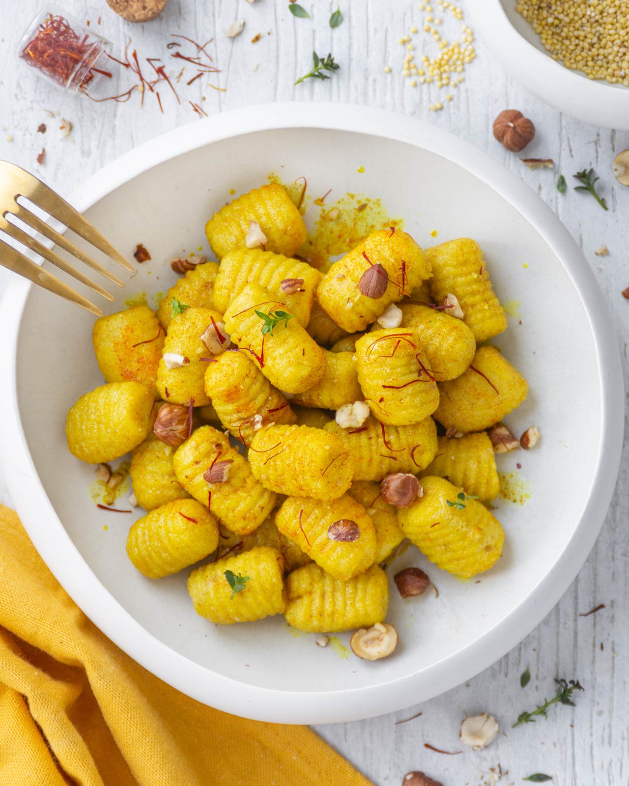 Il suo profilo aromatico è complesso: caldo, leggermente amarognolo, con note floreali e terrose. Oltre al colore intenso che conferisce alle preparazioni, lo zafferano è apprezzato per la sua capacità di arricchire piatti semplici con profondità e carattere. Io lo utilizzo sia in polvere che in pistilli*, perfetti per decorare e aggiungere un ulteriore nota di colore e sapore al piatto, come nel caso di questi gnocchi di miglio.