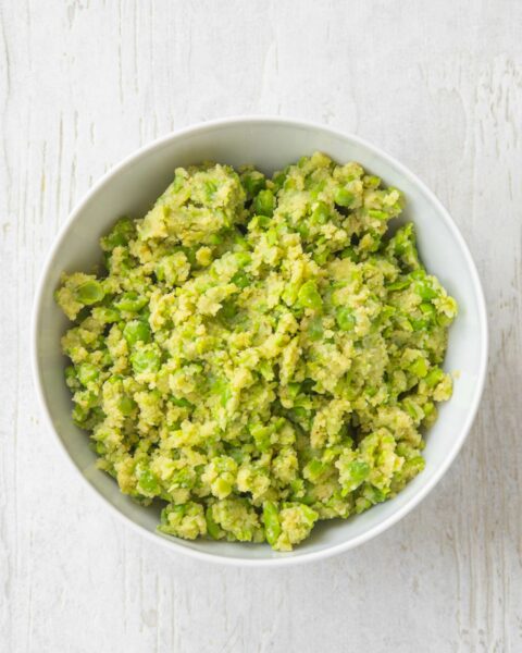 Nel frattempo ho scaldato un cucchiaio di olio EVO in una padella antiaderente e ho fatto imbiondire il soffritto. Ho unito i piselli surgelati e cotto 10 minuti aggiungendo poca acqua calda all’occorrenza. Una volta cotti, ho lasciato intiepidire e schiacciato con la forchetta, per ottenere una consistenza rustica.