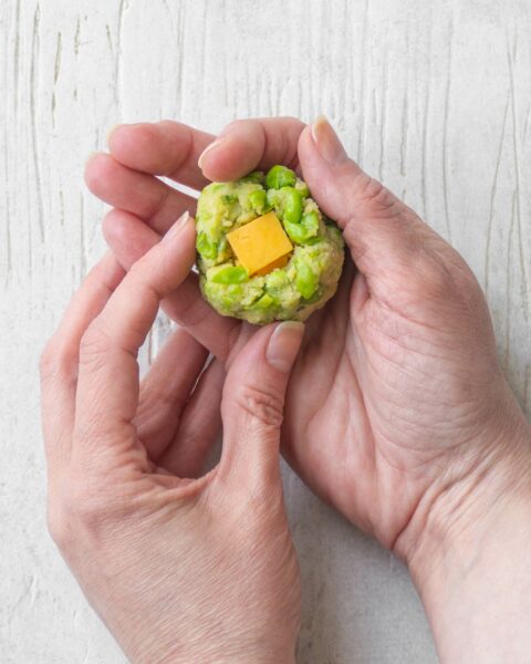 Ho tagliato il formaggio in 12 dadini e l’ho spinto all’interno delle polpettine, rimodellandole bene.